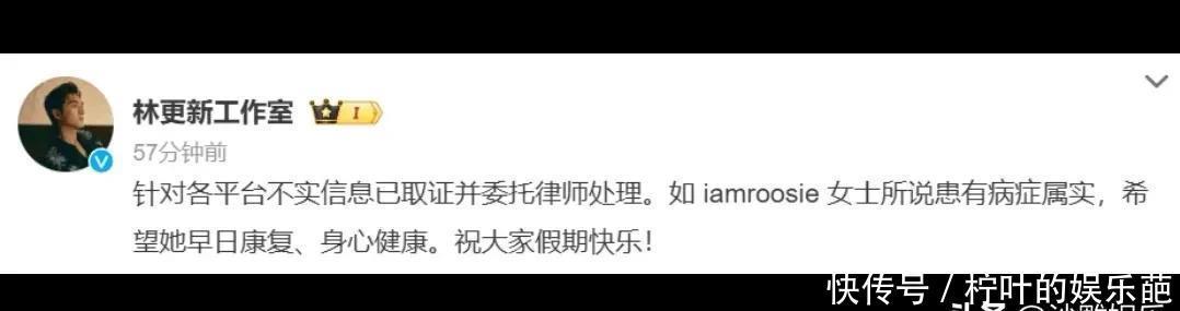 其中,林更新工作室的回应堪称“神来之笔”,他们在声明最后加了一句:“如 iamroosie 女士所说患有病症属实,希望她早日康复、身心健康。” 这句看似客气的祝福,被网友解读出了满满的讽刺意味,堪称“内涵式辟谣”的典范。